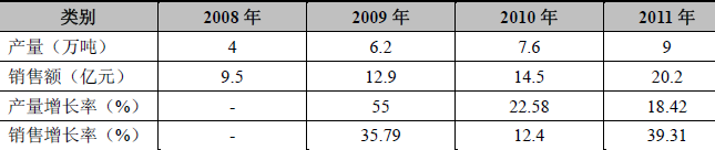 根据中国调味品协会数据,2008 年至2011 年规模以上企业香辛料及香辛料调味品生产销售情况如下: