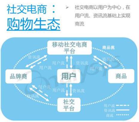 社交电商应运而生,即借助社交网站、SNS、微博、社交媒介、网络媒介等传播途径,通过社交互动、用户自生内容等方式,运用关注、分享、沟通、讨论、互动等社交化的元素,从而达到商品和服务的成交。其本质是,构建以用户为中心,在用户流、资讯流基础上实现商流,以社交平台为媒介的购物生态。