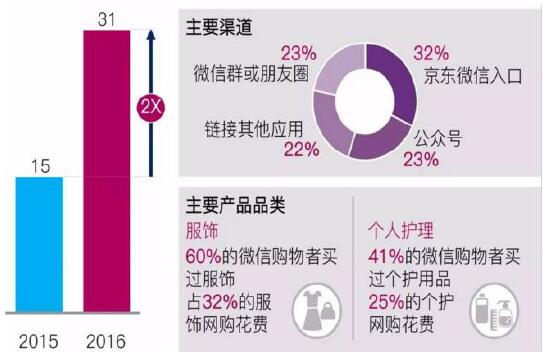 互联网尤其是移动互联的普及为社交网络与购物的融合提供了土壤。中为咨询数据显示,95后平均每天在互联网上花费的时间占到155分钟。麦肯锡数据显示,31%的受访微信用户表示曾经在微信上购物,比去年高出一倍。50%的网购消费者声称会通过社交媒体来了解产品或是寻求建议,而社交媒体不仅能够左右消费者的购买决定,还引导消费者在这些平台上直接购买。微信购物比例较去年翻倍