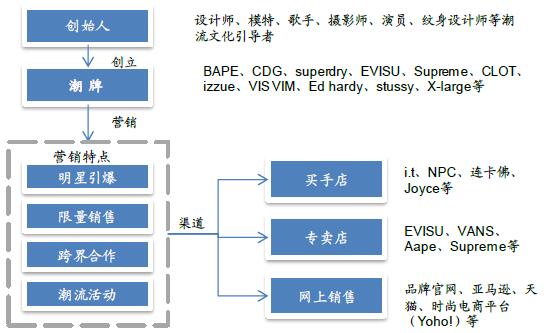 潮牌——是融合了多种年轻人潮流文化元素的服饰类型,其发源于美国,后逐渐传入日本,在里原宿地区发展壮大。进入21世纪以来,潮牌逐渐突破美国及日本,向更广泛的国家和地区传播。潮牌拥有强调原创、符号化、规模小、跨界频繁、品类相对单一、创始人个人特征明显等特点。经营模式上,一般采取向部分明星发放,引发潮流趋势,再进行饥饿营销;跨界合作、邀请明星站台、潮流人物举行活动等也是常用的营销方式。销售渠道方面,主要通过买手店,品牌专卖店、网店等渠道销售。