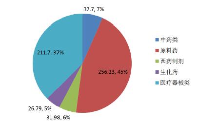 2015年中国医药产品出口额(亿美元)及占比